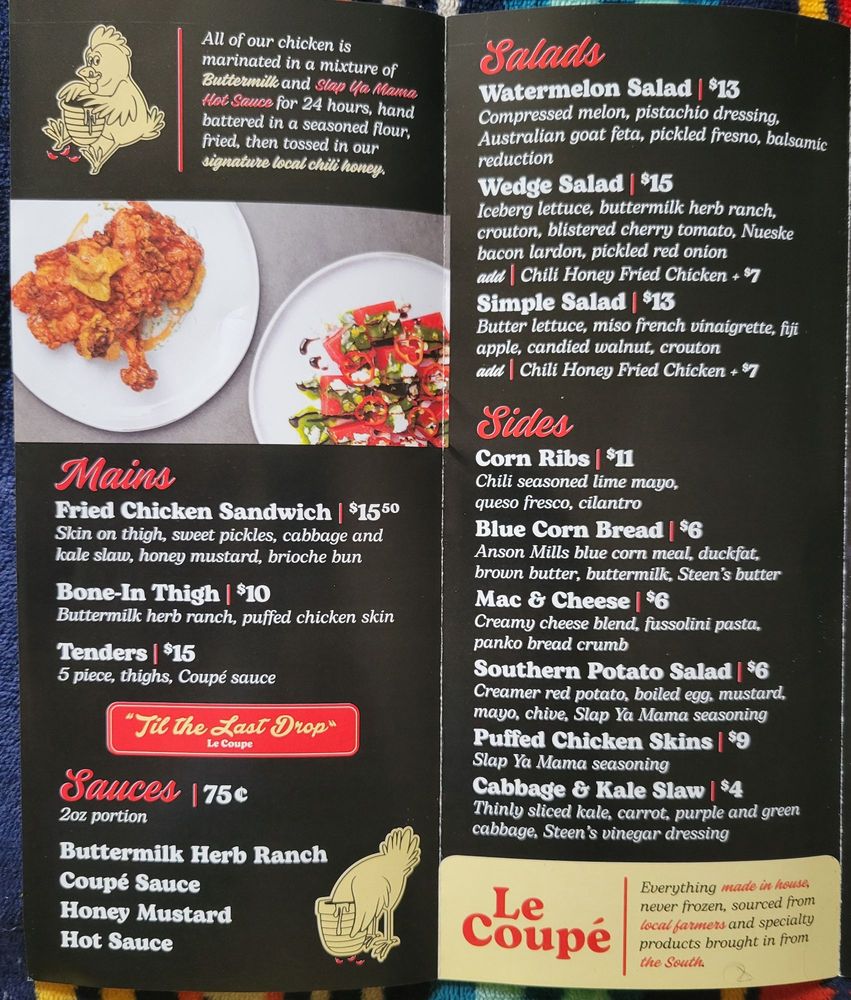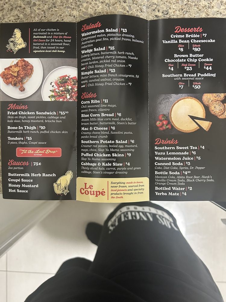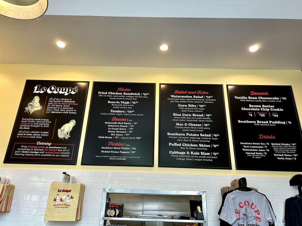 Le Coupe, located in Los Angeles, offers a no-nonsense menu that focuses on delicious chicken dishes. With a range of Southern-inspired options like corn ribs, spicy chicken sandwiches, and watermelon salads, this restaurant stands out for its quality and love put into each dish. Customers praise the friendly service, cozy vibe, and generous portions, making it a hidden gem worth visiting. The restaurant's commitment to sustainability is evident through its use of compostable containers, plastic-free packaging, and reusable tableware. Whether you're a fan of traditional chicken sandwiches or looking to try something new like honey-glazed fried chicken, Le Coupe is sure to impress with its flavorful offerings. Don't miss out on the opportunity to savor their famous cookies and mac'n'cheese, all while enjoying the trendy and hipster ambiance.
